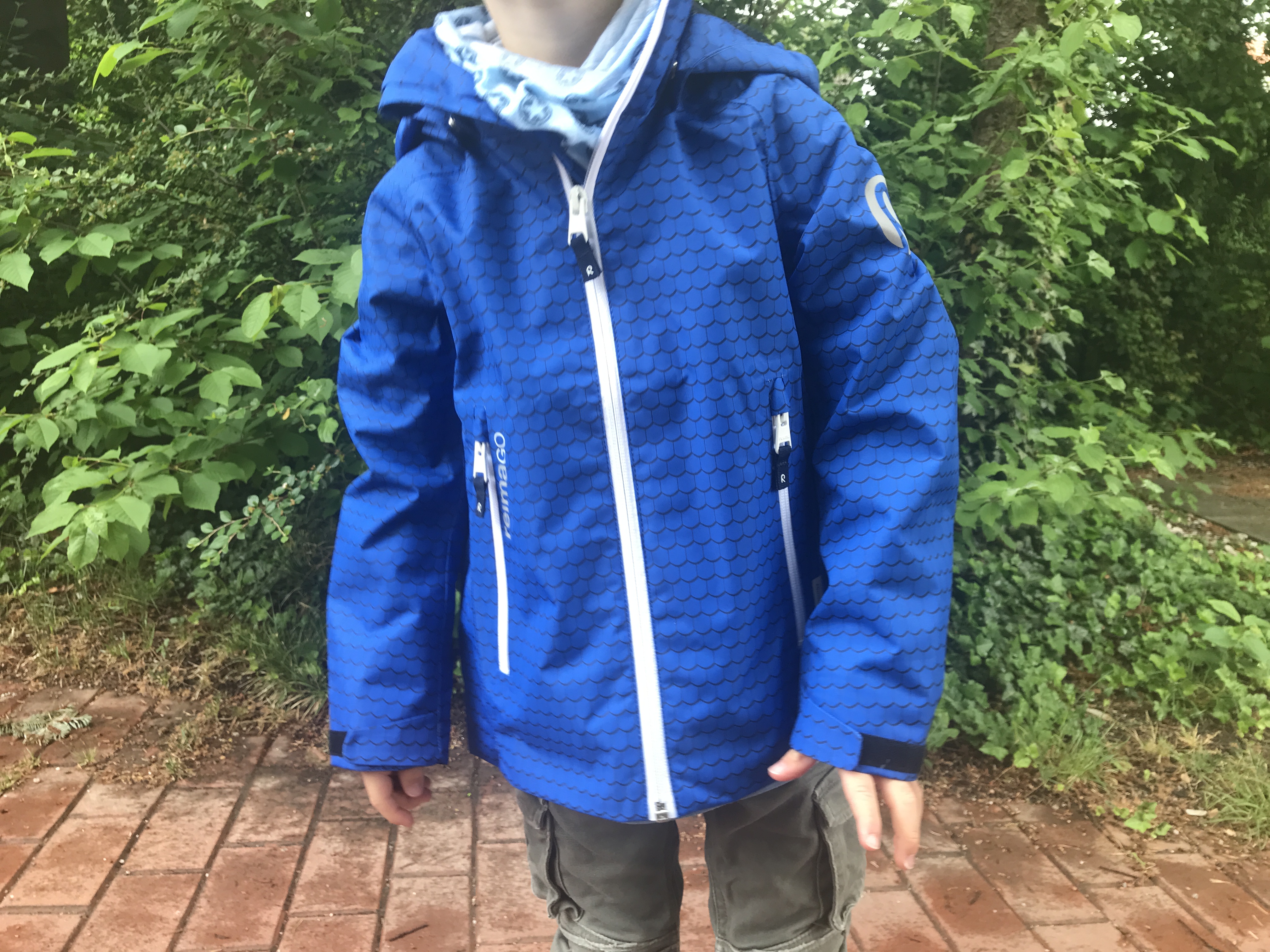 Die Jacke von Reimatec hat ein recht klassisches Design. Die blaue Farbe kommt bei unserem Nachwuchstester sehr gut an. Auch die mit schwarz aufgedruckte Wabenstruktur gefällt ihm gut und er fühlt sich mit der Jacke sogleich wie ein Superheld! Die Reißverschlüsse sind rein weiß und heben sich farblich sehr schön ab. An den Bündchen kann die Jacke mit Klettverschlüssen und an der Hüfte mit Kordelzügen individuell auf die Passform des Kindes angepasst werden.