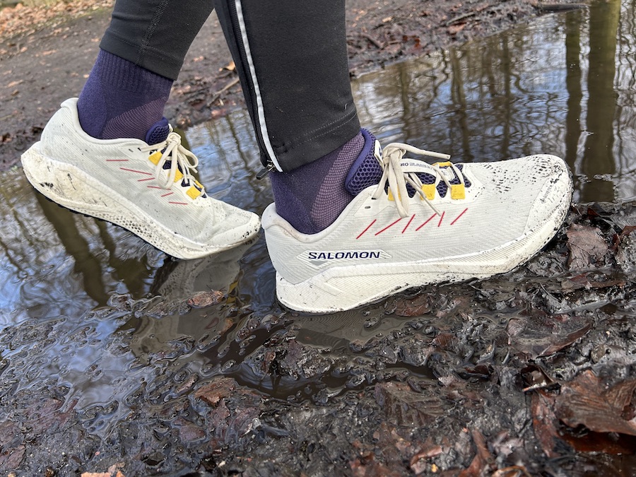 Die erste Anprobe des Salomon Aero Blaze 3 Gravel GTX ist etwas unangenehm, da der Schuh für meine Knöchel nicht tief genug ausgeschnitten ist und bei den ersten Laufkilometern vermuten lässt, dass hier eine Reibestelle entsteht. Zudem bildet sich beim rechten Schuh eine Falte im Vorfußbereich, vermutlich durch das etwas festere Gore-Tex-Material. Ansonsten ist der Schuh bequem und macht auf den ersten Laufkilometern schon richtig Spaß. Er bietet einen guten Vortrieb.