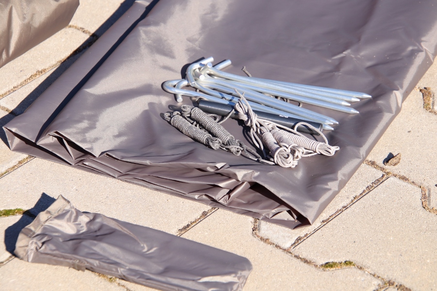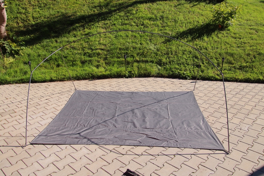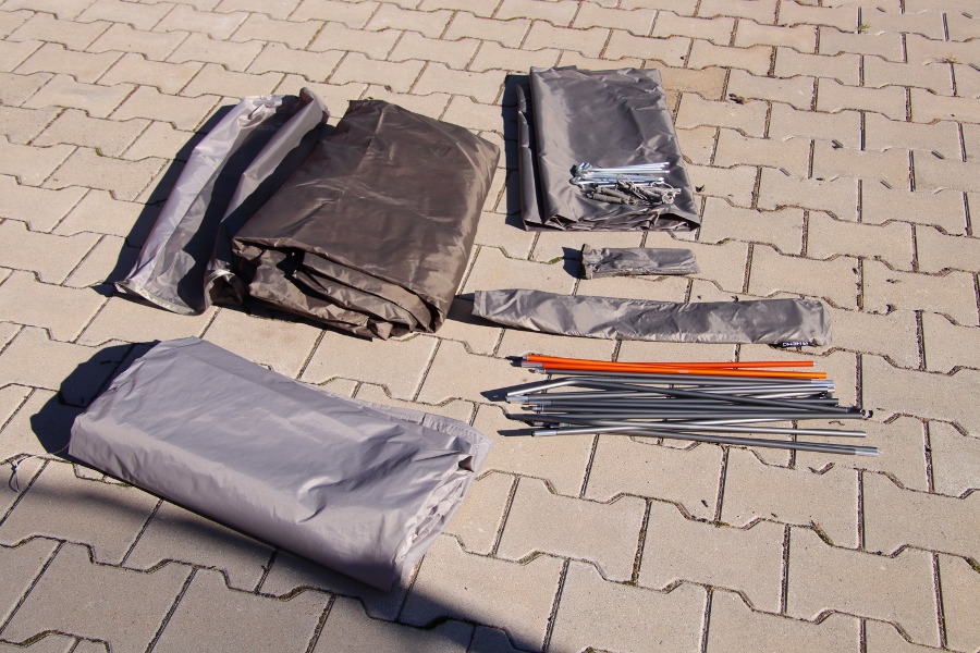 Viele Planen, Folien, Heringe, Seile und das lästige Gestänge. Zuerst immer ein hilfloses Gefühl wie denn das alles zusammen gehören soll. Kurzer Blick und ein wenig Ordnung helfen hier immer. Die Aufbauanleitung hängt hier direkt mit im Packsack eingenäht und selbst ein Produktfoto, wie das ganze Fertig auszusehen hat kann hier immer gut weiterhelfen. Bei unserem Versuch das Gestänge richtig zusammen zu finden wurden wir sofort überrrascht. Hier hängt alles zu 99% zusammen und man kann gar nicht aus.