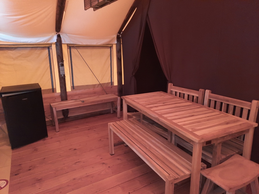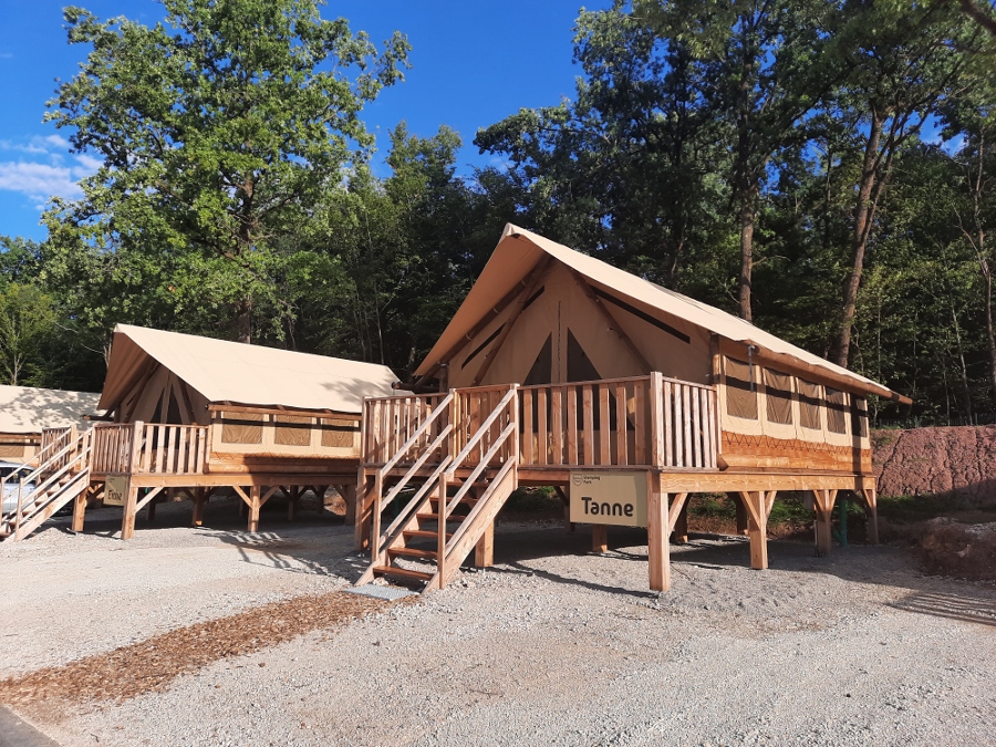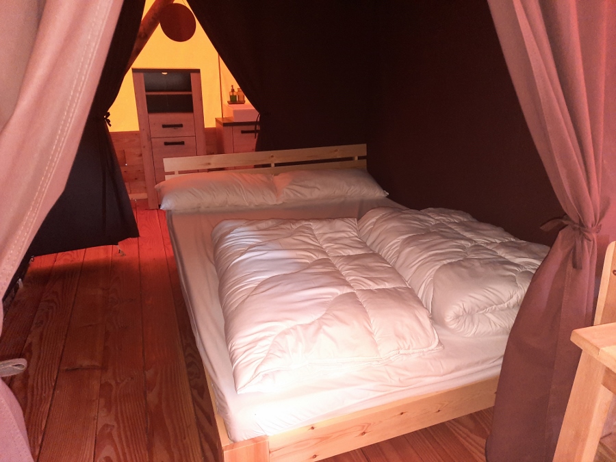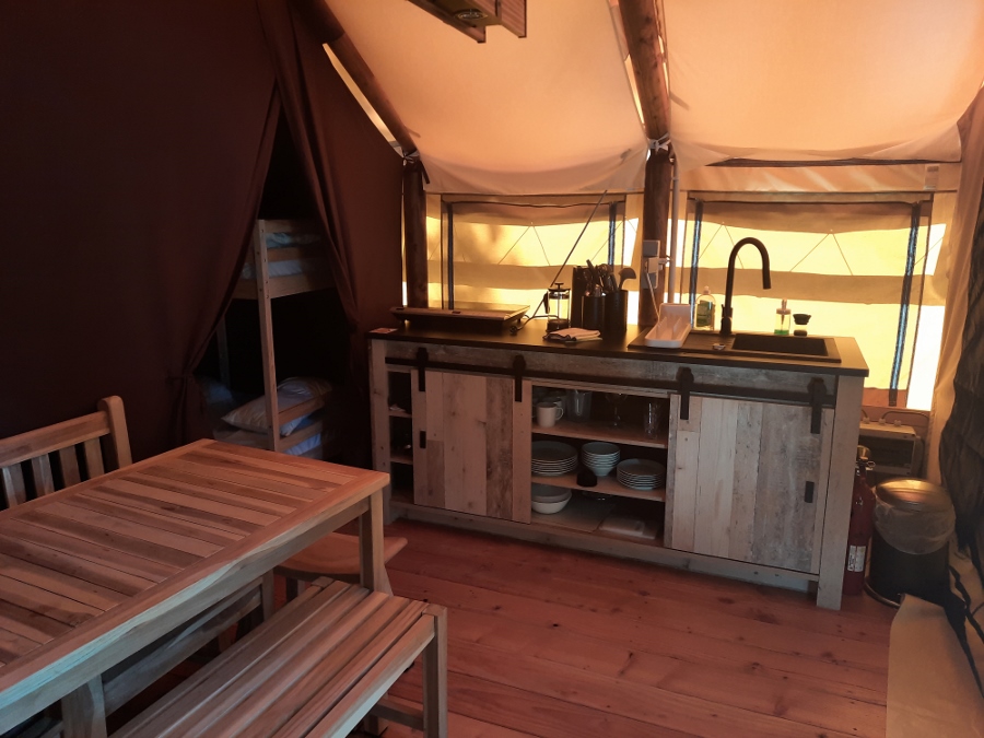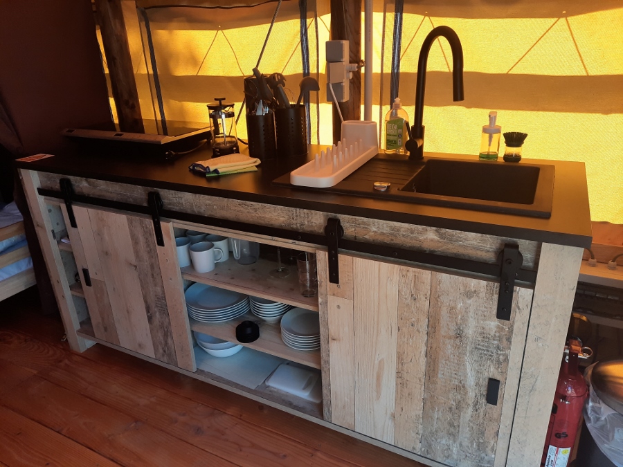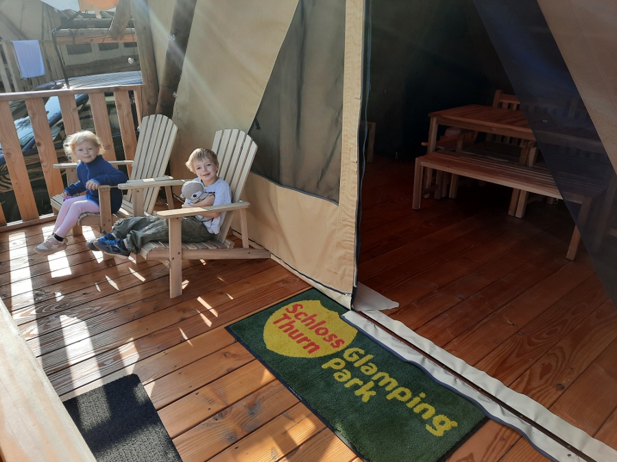 Unser persönliches Highlight im Glamping Park Schloss Thurn sind die Safari Lodges. Auf Stelzen aufgebaute Zelte in Übergröße, die Platz für bis zu 6 Personen bieten. Gemütlich ausgestattet mit eigener Küche, Essbereich, Toilette, Waschbereich und sehr kuscheligen Betten. Die Lodge Terrasse bietet ein schönes Plätzchen um den Abend mit einem Glas Wein oder Bierchen ausklingen zu lassen. Zugehöriges Bettzeug und Handtücher gibt es beim Check in an der Rezeption. Das sehr bemühte und liebvolle Personal lässt hier am Glamping Park eigentlich keine Wünsche offen.