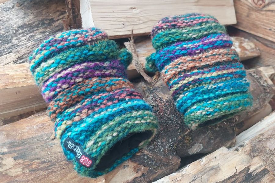 Die handgestrickten Handwärmer aus Lammwolle sind im Inneren mit Fleece ausgekleidet. Dieser Mix sorgt für eine kuschelige Wärme, auch an kalten Tagen. Die Handschuhe werden von Frauen fair und unter gerechten Arbeitsbedingungen in einer kleinen Fabrik in der Nähe von Katmandu hergestellt.