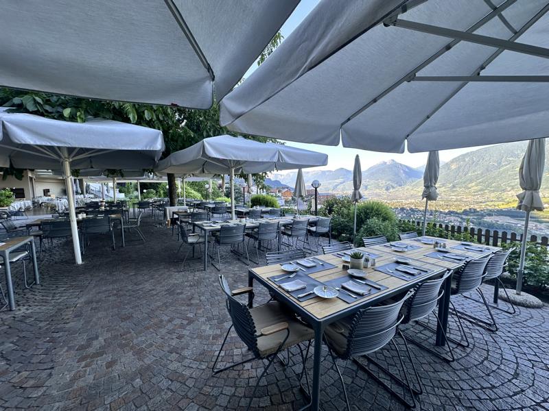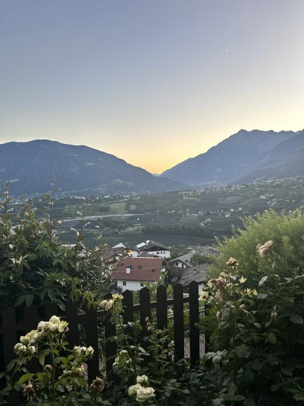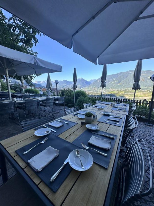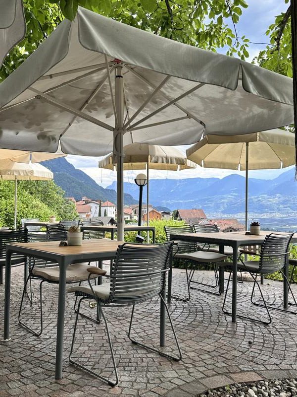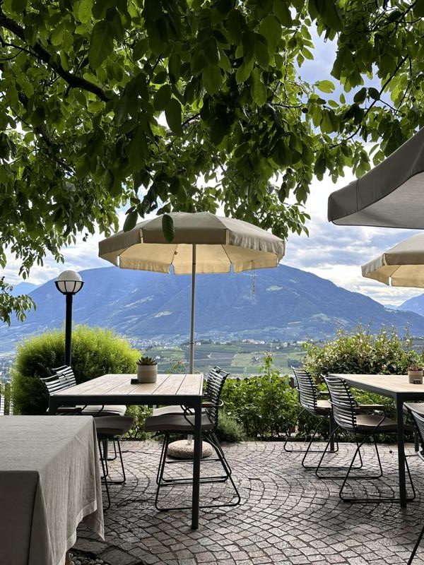 Die Weinberge von Schenna liegen einem zu Füßen, das Etschtal zieht sich wie ein Band in die Ferne, und die majestätische Texelgruppe rahmt dieses Bild ein. Hier verliert man das Gefühl für Zeit und Raum, und nicht selten bleibt man länger sitzen als geplant – einfach, weil man nicht weg möchte.