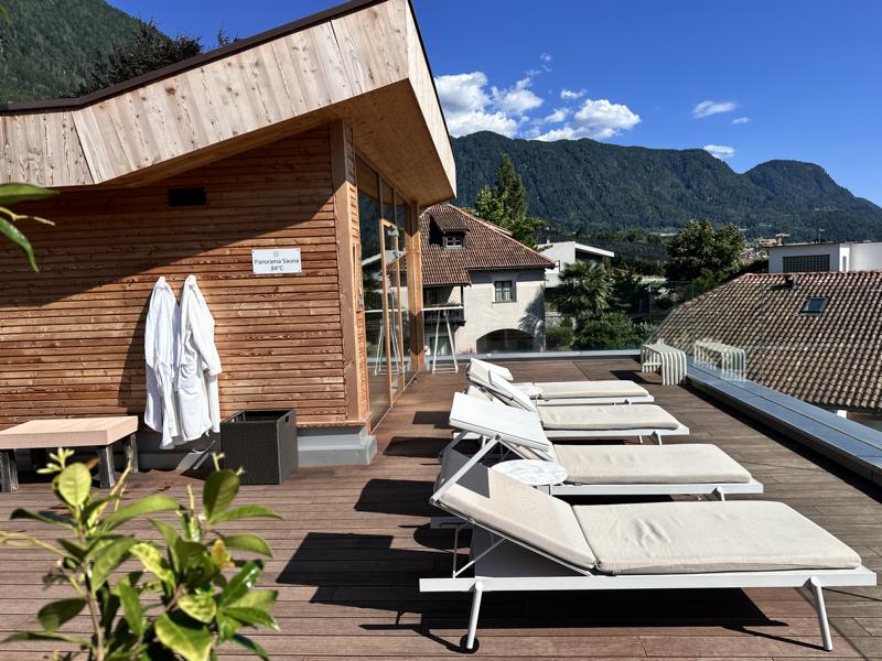Das Herzstück des Hauses ist das VistaSpa, eine 2 200 m² große Wellnesswelt, die zum Abtauchen einlädt. Das Highlight ist das Dach: der Infinity-Solepool, in dem man scheinbar schwerelos über den Dächern von Schenna schwebt.