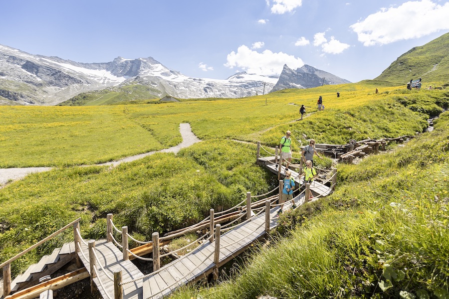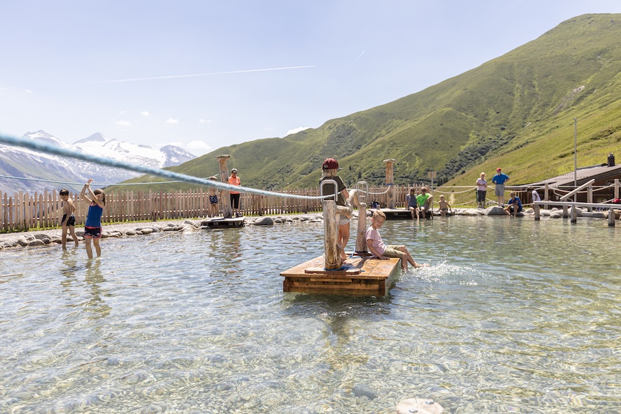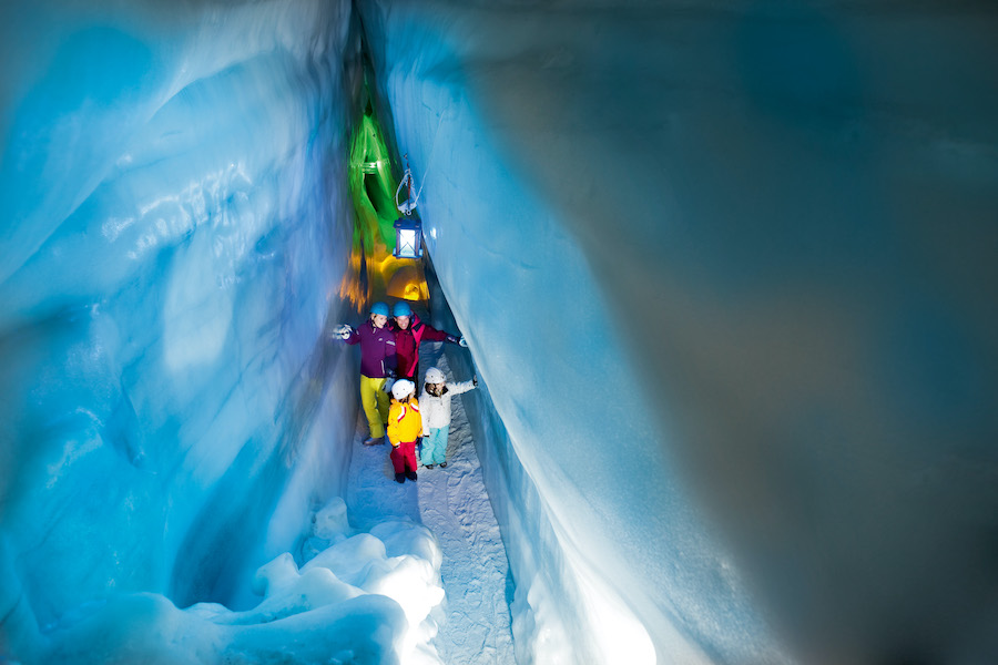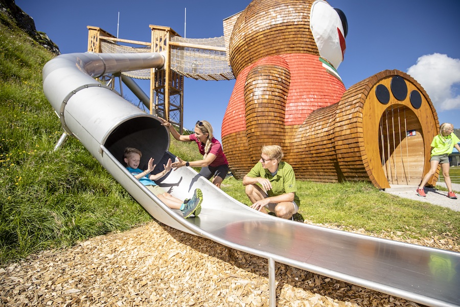 Hintertux liegt am Talschluss. Hierher locken gleich drei Erlebniswelten. Um den prasselnden Schraubenwasserfall mit seinen Felsenkesseln, Felsbrücken und Höhlen liegt die Wasserwelt. Das lebensnotwendige Naturelement ist Thema auf allen Stationen. „Wasser marsch“ heißt es auf der großen Wasserfallschaukel und beim Zielschießen mit Wasserpumpen. Oben auf der Sommerbergalm am Hintertuxer Gletscher wartet Luis‘ Gletscherfloh- und Kugelsafari mit einem Abenteuerparcours aus interaktiven Stationen und kniffligen Rätselfragen auf. Von einem Turm mit Kran und Loopings rollen die Holzkugeln über drei Bahnen, Kreisel und Kurven ins Ziel. Auf 3.250 Meter am Hintertuxer Gletscher liegt Luis‘ Gletscherflohpark mit Riesengondel, Reifenkarussell, Bob- und Tubingbahn. Schon allein der Ausblick in das Meer der Alpengipfel von der Panoramaterrasse aus sind die Auffahrt mit der höchstgelegenen Zweiseil-Umlaufbahn der Welt wert. Familien mit Kindern ab sechs Jahren können außerdem 30 Meter tief in das 640 Meter lange Höhlensystem des Natur Eis Palastes unter dem Gletscher hinuntersteigen oder in der Spannagelhöhle zurück in die Steinzeit reisen.