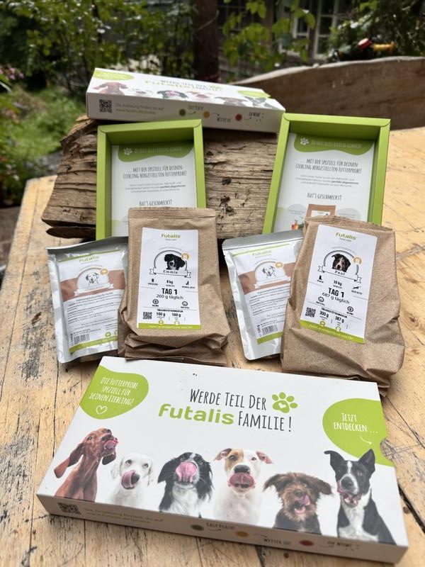 Unsere erste Lieferung haben wir von Futalis bekommen. Kaum bestellt, lag das Paket 48 Stunden schon bei uns auf dem Hundesofa. Bei futalis können Hundehalter das Futter ihres Vierbeiners individuell anpassen. Im Bestellprozess werden Daten wie Rasse, Größe und Gewicht angegeben, woraufhin ein passender Futtervorschlag erstellt wird. Das maßgeschneiderte Futter wird in Tagesrationen verpackt und direkt nach Hause geliefert. Es basiert auf hochwertigen Rohstoffen, ist frei von Konservierungs- sowie Farb-, Lock- und Geschmacksstoffen und wurde von einer Tierärztin am Institut für Tierernährung der Universität Leipzig entwickelt.