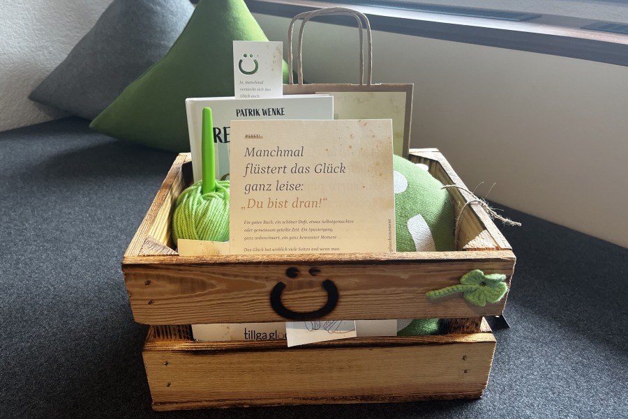 Das Wichtigste im Zimmer ist das „Glückskisterl“. Nicht umsonst ist auf der Homepage das Zitat: „„Das Glück ist das einzige, das sich verdoppelt, wenn man es teilt“ zu finden, denn schon ab der ersten Minute wird klar, im Tillga Glück geht es wirklich ums Glücklichsein. Das Glückskisterl ist eine kleine, liebevoll gestaltete Box, die vollgepackt ist mit feinen Dingen, die dazu Einladen, einfach mal Innezuhalten. Ein Buch, um das Glück nachzulesen, ein aromatisches Betthupferlspray und das Wichtigste: Wolle und Häkelnadel, um ein Kleeblatt zu häkeln.