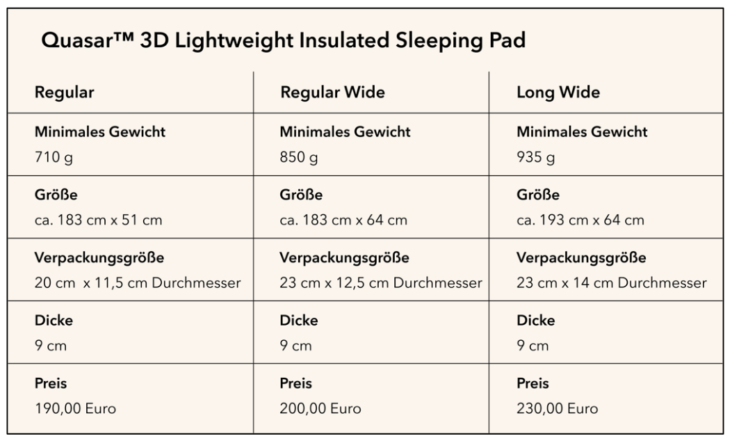 Trotz ihres Komforts bleibt das Gewicht moderat. Preislich liegt die Quasar™ 3D Insulated je nach Variante zwischen 190 Euro (Regular) und 230 Euro (Long Wide).