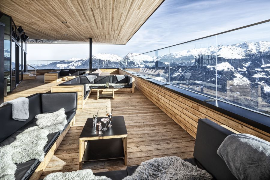 - Lounge-Möbel auf der Terrasse mit Weitblick auf die Bergwelt