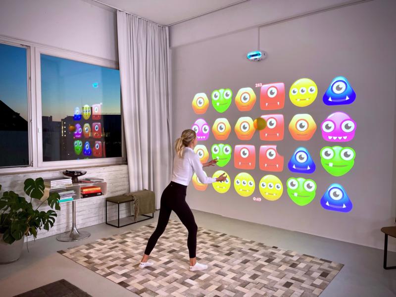 Die Konsole wird an einer Wand befestigt und mit einem beliebigen Projektor über HDMI verbunden. Die Sensoren der Konsole scannen den Raum in Echtzeit und ermöglichen so völlig neue Interaktionsmöglichkeiten und direktes Bewegungs-Feedback