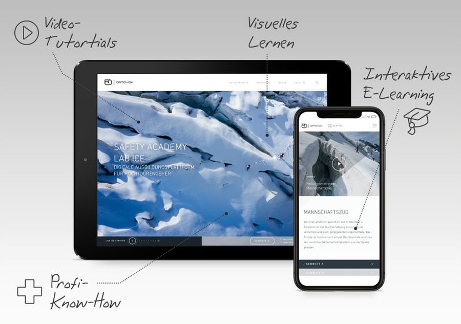 In enger Zusammenarbeit mit dem Verband Deutscher Berg- und Skiführer (VDBS), seinen zahlreichen Profi-Bergführern und Athleten präsentiert Ortovox das „Safety Academy Lab Ice“: eine interaktive, multimediale Ausbildungsplattform, entwickelt im Rahmen der Safety Academy. Sie bereitet in 18 Video-Tutorials und umfassenden Lern-Modulen in drei Kapiteln alle Sicherheitsaspekte für das Hochtourengehen akkurat und verständlich auf: