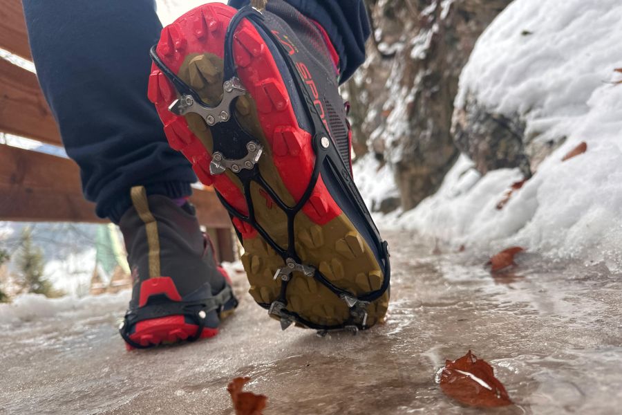 Beim ersten Anlegen fällt auf, dass die Ghost ein eher strammes, enges Sitzgefühl bieten – gewollt, um ein Verrutschen zu vermeiden. Ein Tipp aus der Praxis: Spikes im Warmen anziehen, bevor man in die Kälte geht. Mit kalten Fingern kann das Handling anfangs etwas fummelig sein, und ein sorgfältiger Sitz sorgt später für besseren Grip. Sind sie einmal korrekt positioniert – mit fest anliegendem Elastomer-Harness – sitzen sie sicher und komfortabel, auch über längere Distanzen.