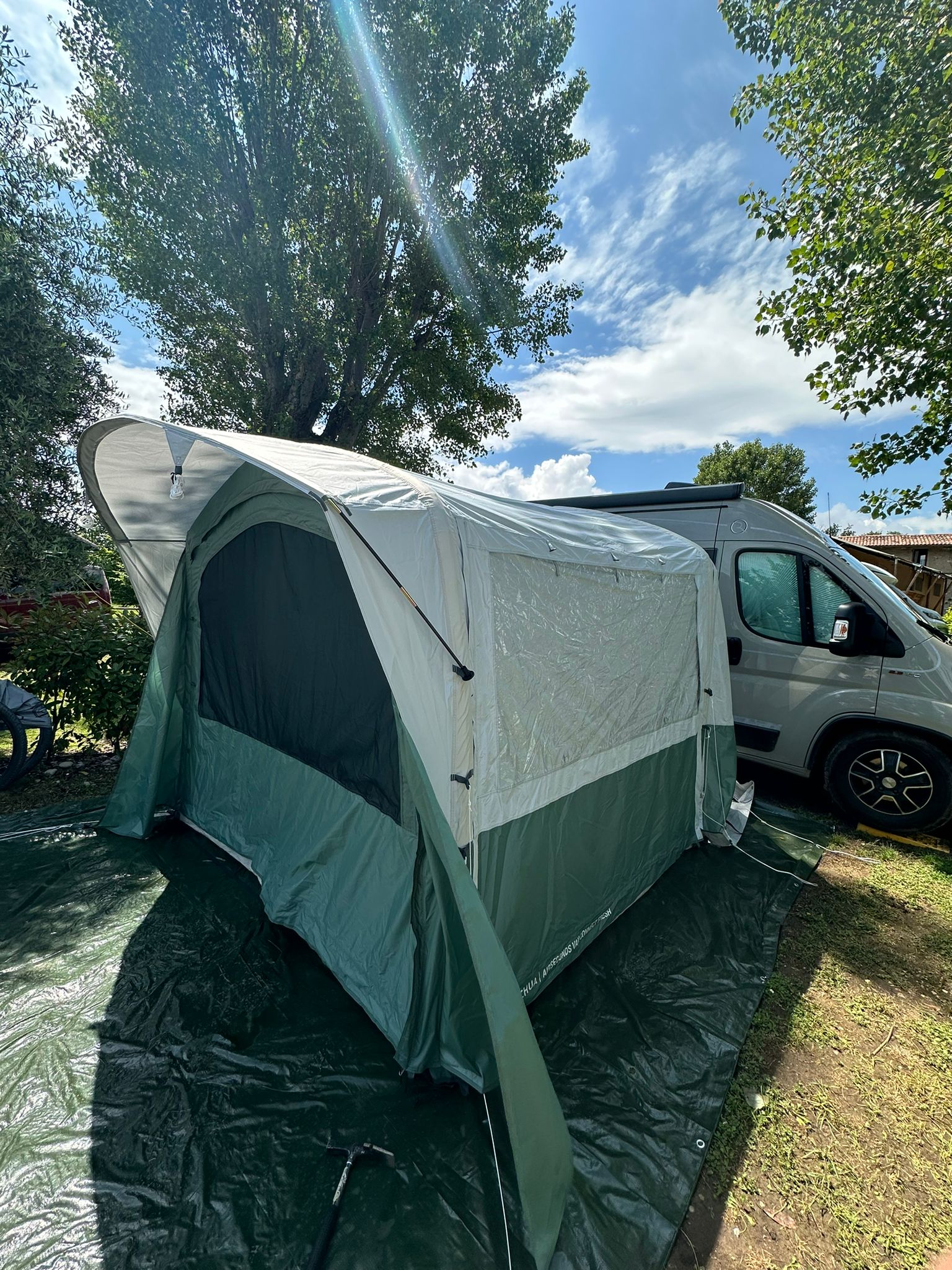 Schweißausbruch 2 erfolgte dann am ersten Campingplatz bei Regen in Südtirol. Kleiner Tipp, das Paket immer auf Vollständigkeit bei eintreffen checken. Und nicht davon ausgehen, dass beim Preis von fast 600 Euro eine Luftpumpe bei der Lieferung enthalten ist.