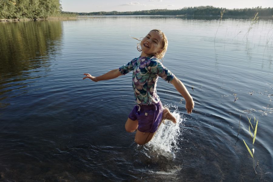 Egal ob Schwimmen im Meer oder Planschen im Bach – wer am Wasser spielt, ist der Sonne und den UV-Strahlen ausgesetzt. Die Reima SunProof Kollektion hat einnen UV-Schutz von 50+ und besteht zu 80% aus recyceltem Polyester.