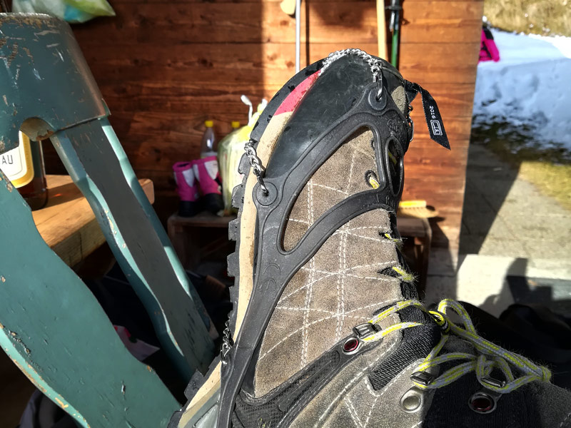 Die Anwendung der Chainsen Trail-Spikes ist denkbar einfach und erfordert nur wenige Sekunden, ohne zusätzliche Riemen und Schnallen. Man kennt das, der Schneeuntergrund ist nicht gerade vertrauenswürdig und es ist nach zwei, drei wackeligen Momenten geschafft, Strecke A nach B, ohne Sturz zu absolvieren. Aber genau hier können die Spikes von Snowline helfen, denn sie geben einfach Sicherheit und somit ein besseres Gefühl. Es wäre falsch, sie einfach als schrulliges Nischenprodukt abzustempeln, denn sie erweitern den Wirkungsradius Eurer Lieblingswinterschuhe um ein Vielfaches! Auch Vibram (bei dem gezeigten Modell von Salewa im Einsatz) kennt Grenzen… Der Schreiber dieser Zeilen war jedenfalls bass erstaunt.