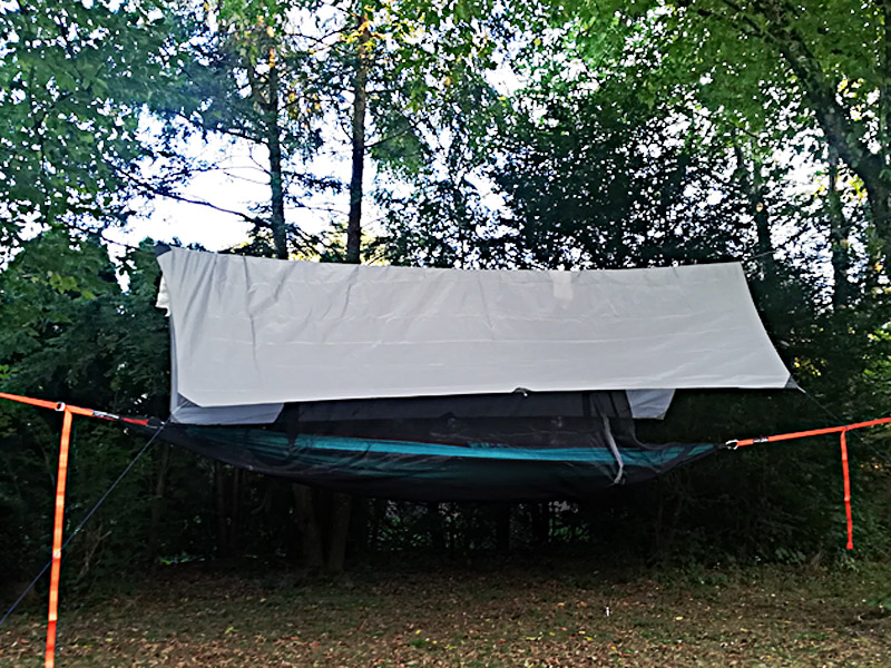 Gewichtstechnisch muss man als Camper hier etwas mehr einkalkulieren, wenn man das Hammok-Setup mit einem der leichteren Einmannzelte vergleicht (gegenüber 2,25 Kilo Gewicht). Aber auch das Packmaß der relativ vielen Einzelteile, fällt leider etwas negativ aus. Desweiteren gibt es eine psychologische Hürde, die es beim Ein- und Ausstieg zu überwinden gilt. Aber das schafft man und es ist am nächsten Morgen in Ordnung.