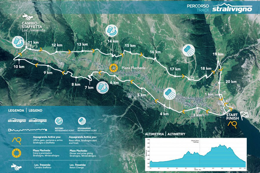 Start und Ziel ist das Aquagranda Active You Wellnesscenter, in dem man sich wunderbar entspannen kann. Organisiert wird die Veranstaltung vom Organisationsteam Stralivigno in Zusammenarbeit mit dem ASD Marathon Club Alta Quota Livigno. Neben der Teilnahme der 21 km besteht ebenso die Möglichkeit die Strecke in Staffeln von jeweils 10,5 km zu laufen.