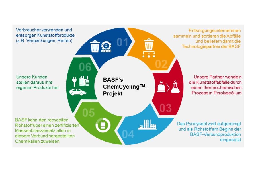 BASF geht mit dem Projekt „ChemCyclingTM“ neue Wege in der Verwertung von Altreifen. Beim chemischen Recycling werden Altreifen und vor allem solche Kunststoffabfälle genutzt, die bislang energetisch verwertet oder deponiert werden, wie etwa verbrauchernahe Kunststoffe, die im Verwertungsprozess aussortiert wurden. In einem thermochemischen Verfahren werden aus diesen Kunststoffen Basischemikalien gewonnen, die als Rohstoffe in den BASF-Verbund eingespeist werden. Über einen Massenbilanzansatz können diese Chemikalien bestimmten im Verbund