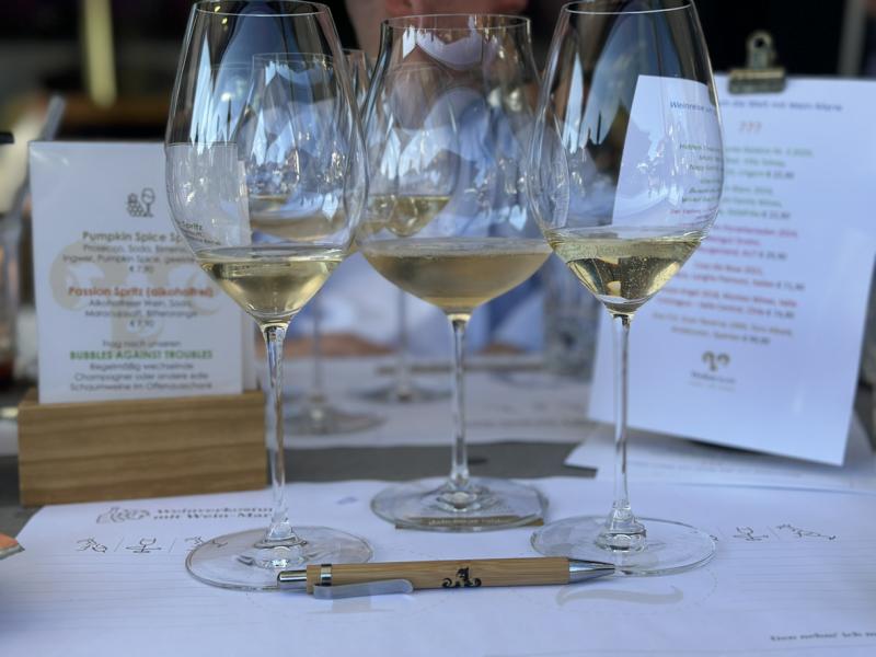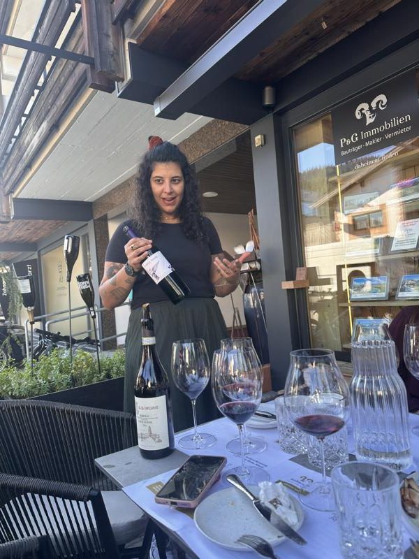 Die Probe startet mit leichten Weißweinen, die Frische und Eleganz verbinden. Spritzige Noten von Zitrus und Apfel öffnen den Gaumen, begleitet von mineralischen Akzenten, die an die alpine Herkunft erinnern. Danach geht es weiter zu kräftigeren Vertretern: vollmundige Rote, mit Aromen von dunklen Beeren, Schokolade und einem Hauch von Gewürzen. Besonders spannend sind die neuen Weine im Sortiment, die uns Wein-Marie präsentiert: moderne Cuvées mit überraschenden Geschmackskompositionen, die den Spagat zwischen Tradition und Innovation schaffen.