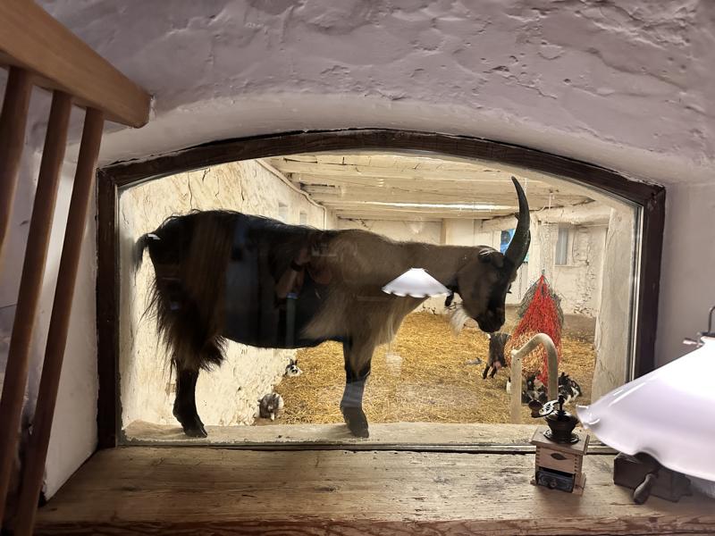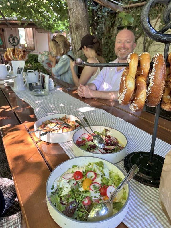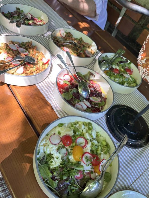 Der Biergarten ist ein kleines Paradies: große Kastanien spenden Schatten, während Kinder zwischen Streichelzoo und Spielplatz voller Entdeckungsfreude toben. Ziegen, Ponys und Hasen schauen neugierig den Gästen zu – der perfekte Ort für entspannte Stunden mit der ganzen Familie.