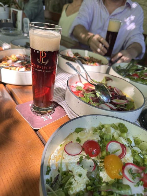 Im „Brewery to table“-Stil erlebt man, wie Bier entsteht und schmeckt es direkt frisch vom Fass – Pfeffer Hell, Pfeffer Schwarz, Pale Ale, saisonale Spezialitäten wie Kastanienbier oder alkoholfreie Varianten wie „Freedl“ laden zum Probieren ein. Auch wir bekommen eine Bierprobe, inklusive spannender Insiderinfos. Und ganz ehrlich? Jede der Sorten ist ein Genuss für sich! Drei alkoholfreie Sorten (Klassik, mit Zitrone, Basilikum), alle zusammengefasst unter der Marke „Freedl“. Wer auf den Alkohol nicht verzichten möchte, der hat die Qual der Wahl zwischen weiteren außergewöhnlichen Geschmacksnoten. Neben dem klassichen hellen Bier findet sich zum Beispiel auch Holzbier, Pfefferbier und Kirschbier im Sortiment.